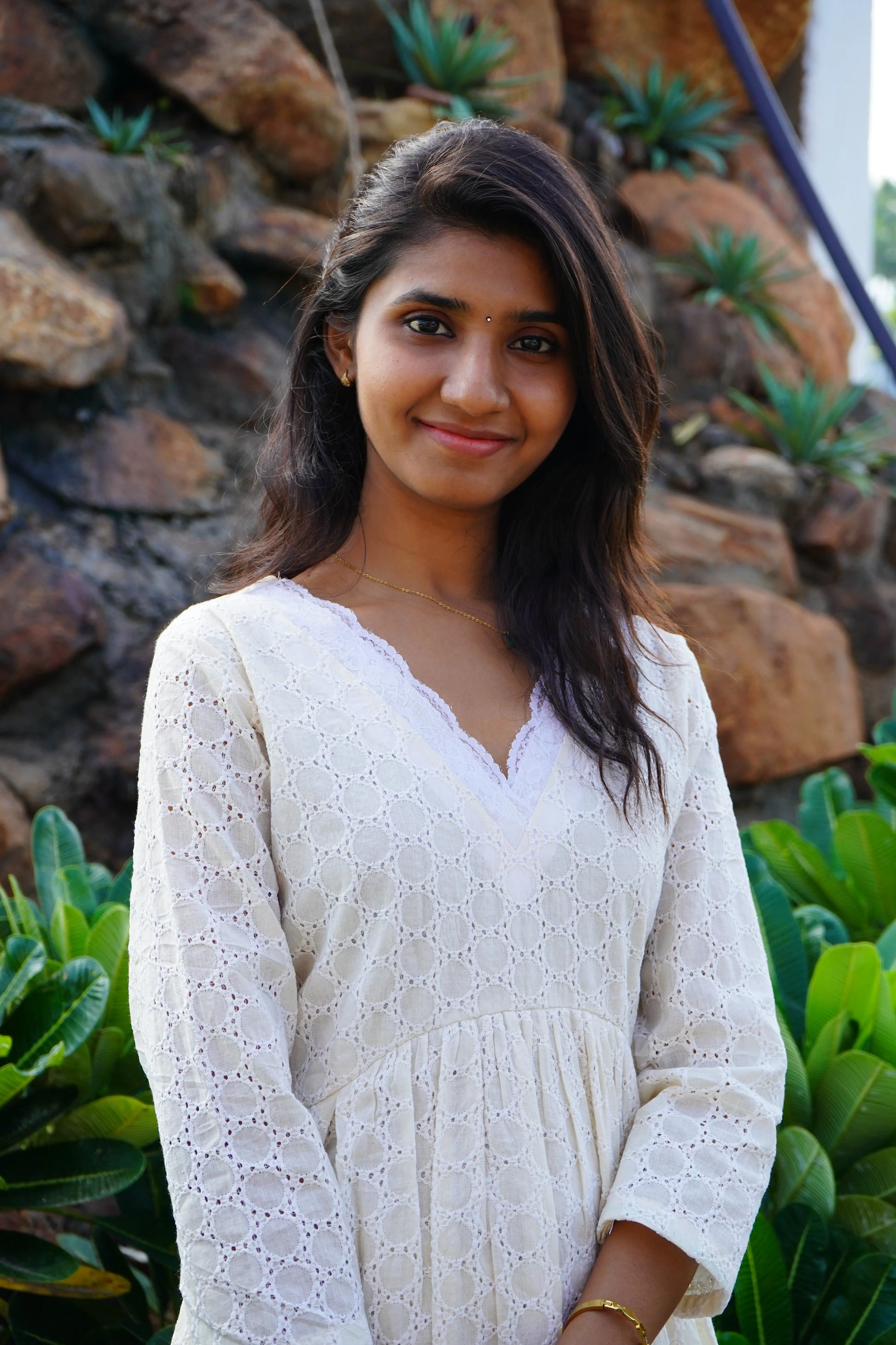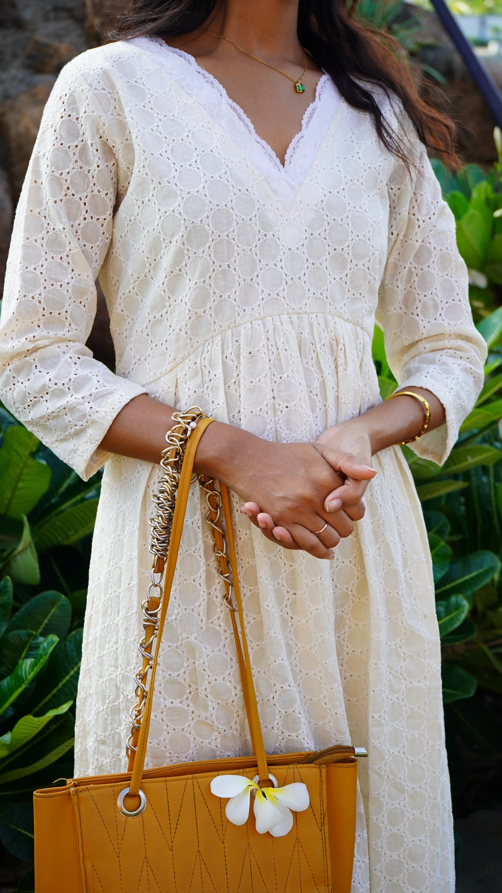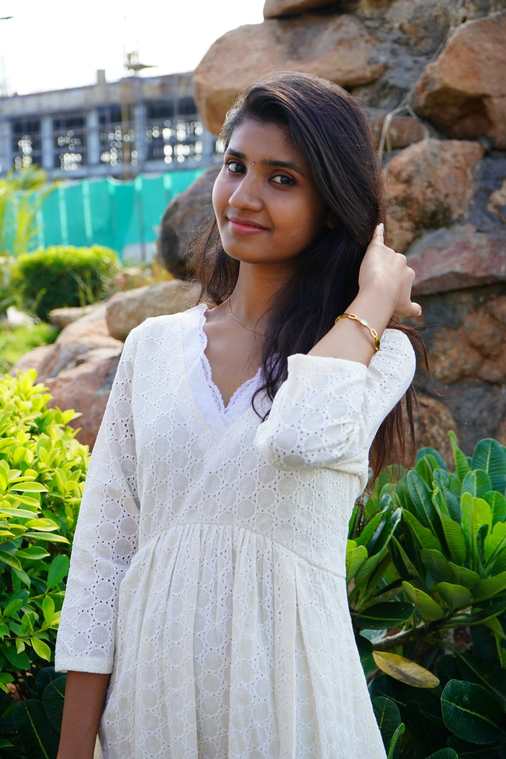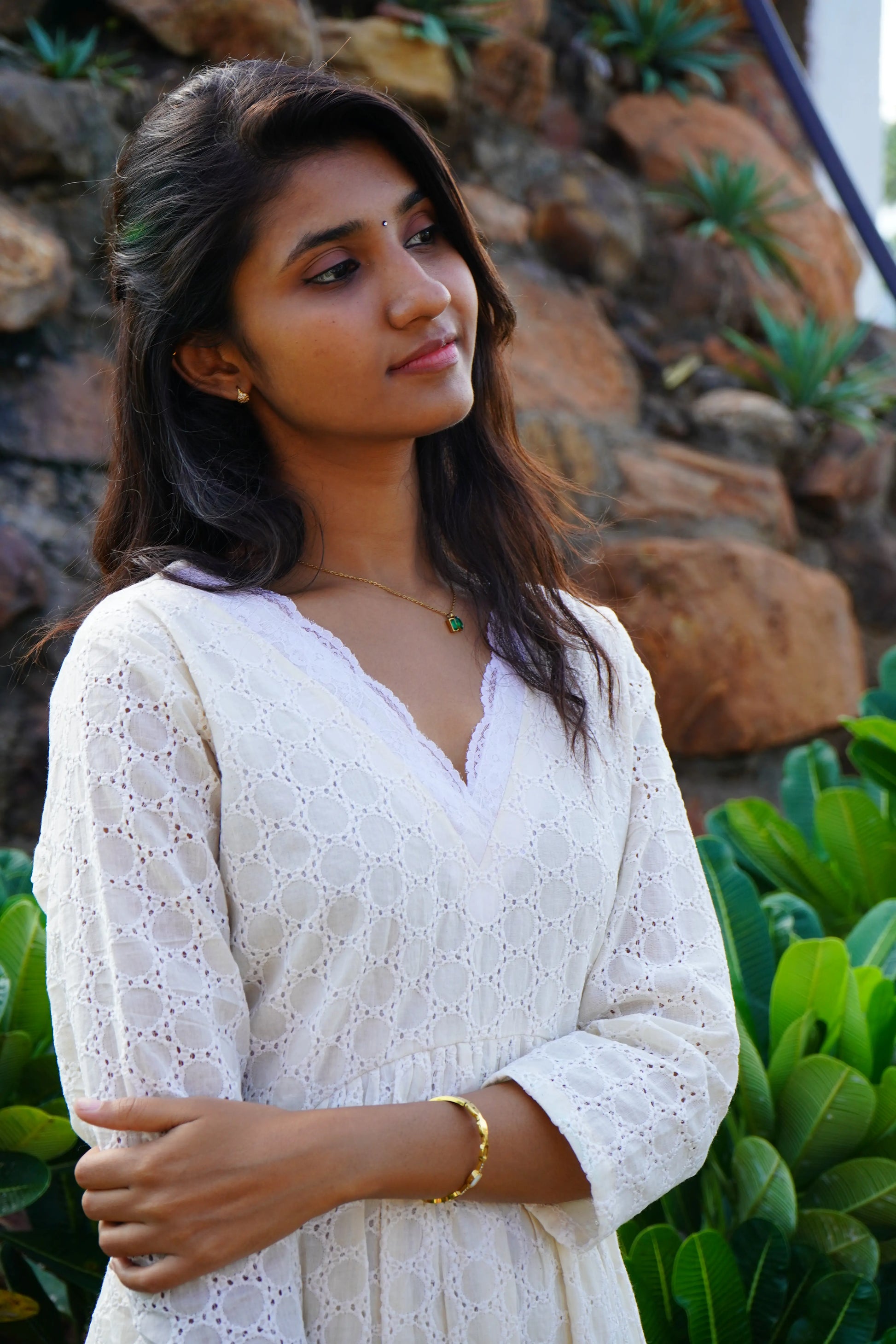 The soft half white shade adds an ethereal touch, while the fine Hakoba fabric ensures breathability and subtle texture. Ideal for casual elegance or festive minimalism, this frock is effortlessly flattering and endlessly versatile.